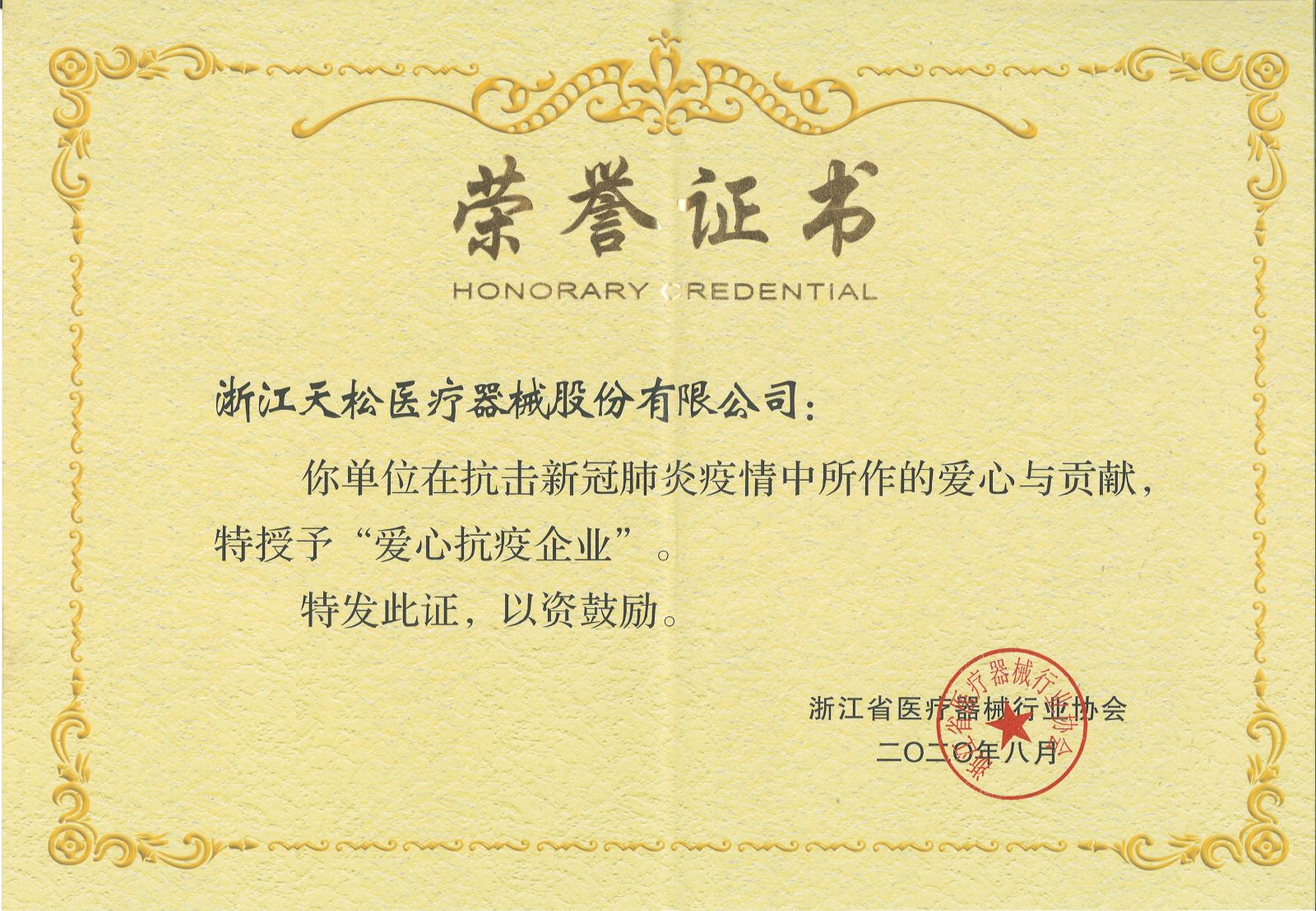 “天災(zāi)無情人有情” 為了表彰在抗疫期間作出突出貢獻(xiàn)的醫(yī)療器械企業(yè),浙江省醫(yī)療器械行業(yè)協(xié)會(huì)舉辦了“愛心抗疫企業(yè)” 表彰大會(huì)。天松醫(yī)療獲“愛心抗疫企業(yè)”榮譽(yù)。公司總經(jīng)理徐斌頂出席了表彰大會(huì)。